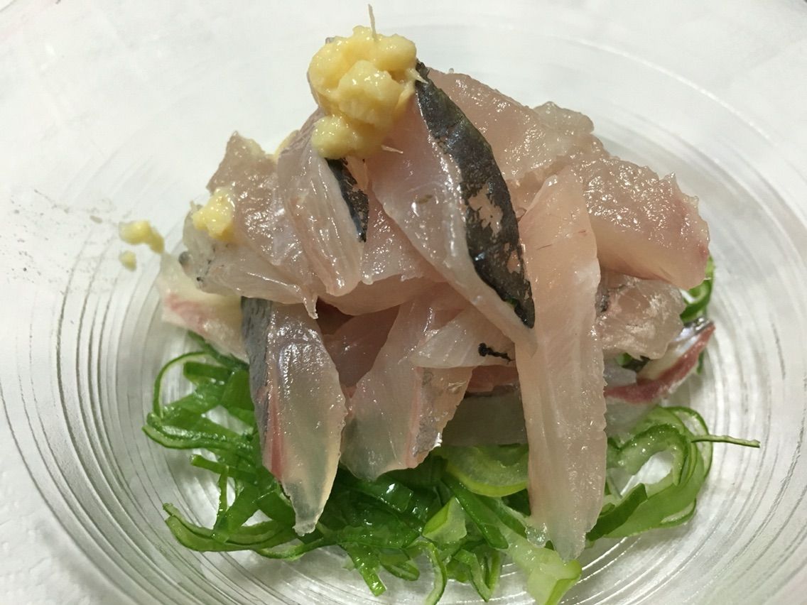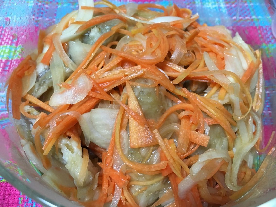 ①アジを三枚おろしにします(頭を残すならエラと内臓をとります)。人参と玉葱は薄く千切りにします。